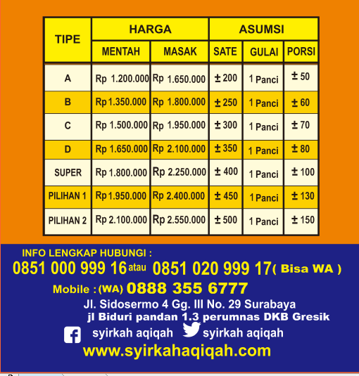 SYIRKAHaqiqah.com, Tempat Aqiqah Surabaya Sidoarjo, Gresik, Bangkalan, Menerima Pemesanan Masakan Aqiqah, Walimah aqiqah, Qurban, Tasyakuran, ataupun hajatan lainnya. Untuk Wilayah kota Surabaya, Sidoarjo, Gresik, Bangkalan, dan Sekitarnya, Silahkan pesan pada Kami.